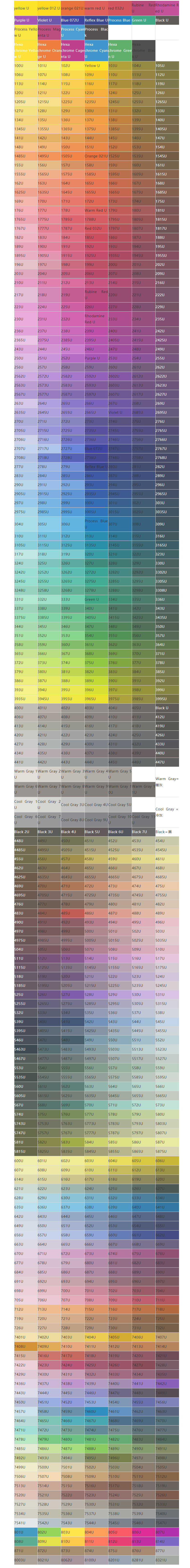 ● 潘通色卡(PANTONE)色卡為國際通用的標準色卡。中文慣稱潘通。PANTONE色卡是享譽世界的色彩權威,涵蓋印刷、紡織、塑膠、繪圖、數碼科技等領域的色彩溝通系統,已經成為當今交流色彩信息的國際統一標準語言