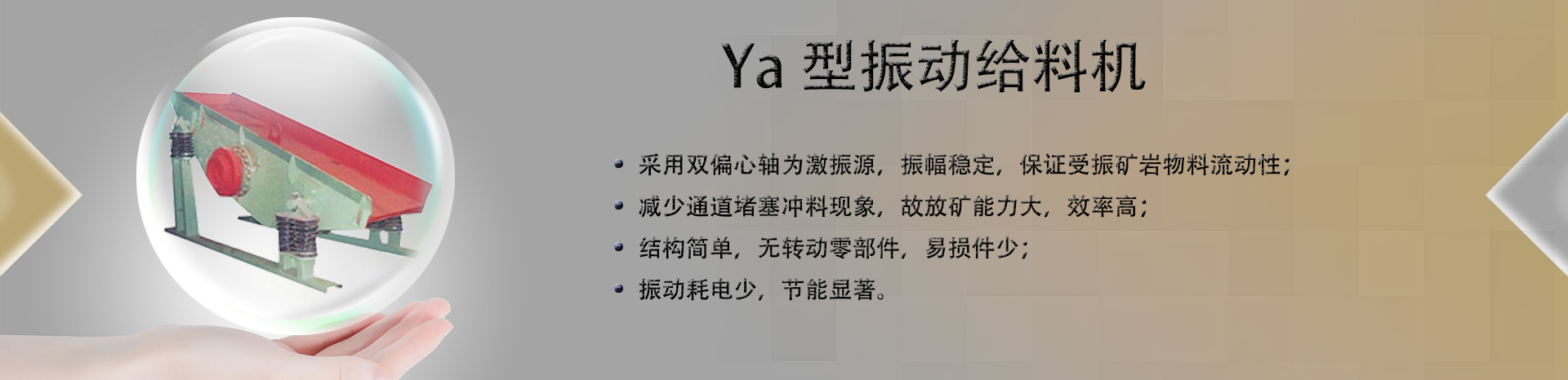 Ya系列給料機主要和是利用皮帶輪和飛輪與偏心軸轉動產生的偏心慣性迫使機器產生振動,從而實現自動給料。在皮帶輪和飛輪上裝有配重塊,用戶可通過增減配重塊來調整振幅,以滿足不同用戶的需要。其主要用于石礦場給料,也可用于冶金、化工和煤炭等工業部門。